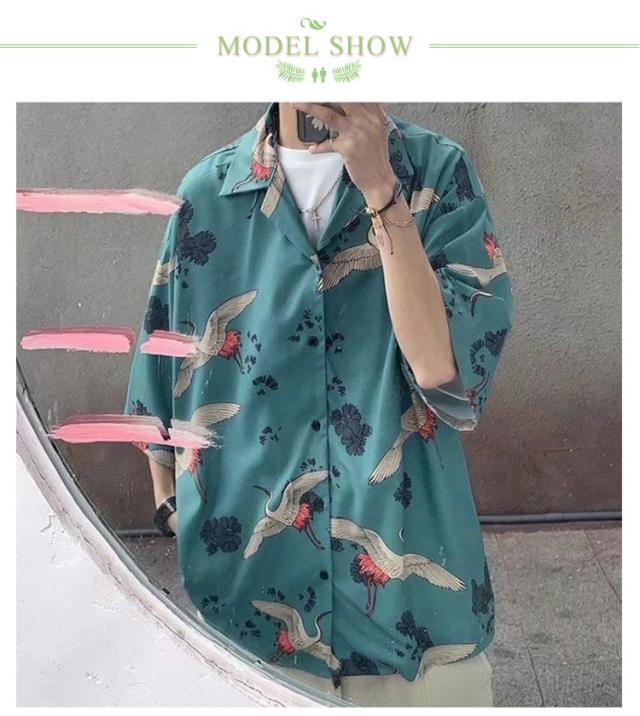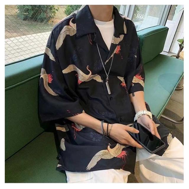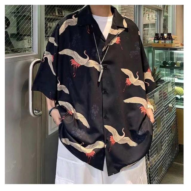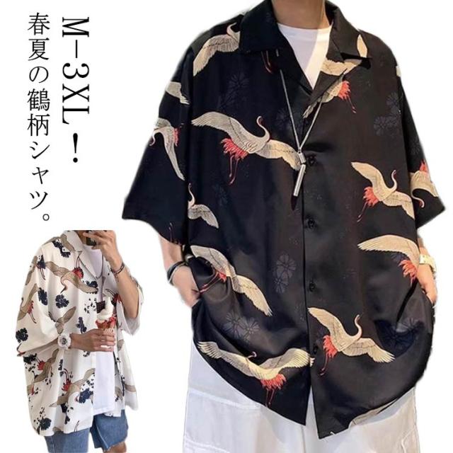 鶴柄 シャツ 和柄 和風 ビッグシャツ メンズ 半袖 シャツ 柄シャツ 総柄 ビッグシルエット アロハシャツ レディース 男女兼用 涼しい カジュアルシャツ 韓国ファッション 大きいサイズ 春 夏 秋 送料無料 M-3XL