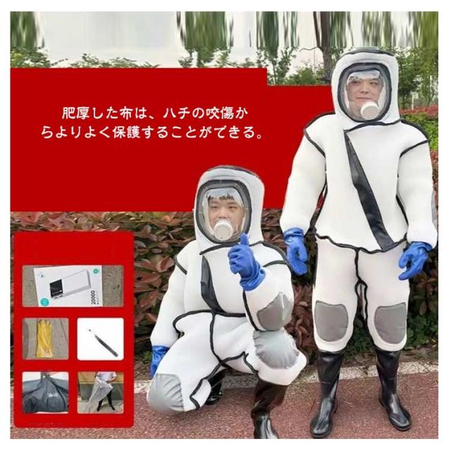 | 通気性が高い扇風機3つ付き、3Dメッシュ構造のスズメバチ駆除用蜂防護服。【手袋、長靴付き】 扇風機3つ付き:後頭部×1、背中×1、顔の前×1に扇風機が付いています(バッテリーが付きません。市販のバッテリーがすべて使えます。) 着心地の良い、柔らかくて通気性抜群ナイロンを採用します。 肥厚した布は、ハチの咬傷からよりよく保護することができる。 3Dメッシュ構造で軽くて蒸れにくい作りで、超軽量で着心地が良く、自由自在に作業できます。 通気性のあるナイロン素材で扇風機が付属しているため、通気性が高く放熱性に優れています。 | |