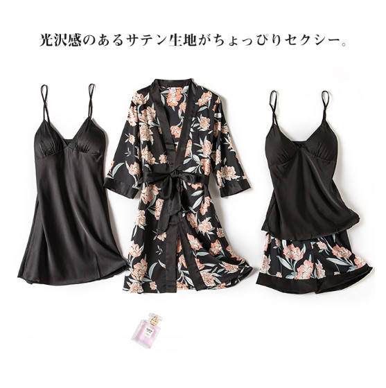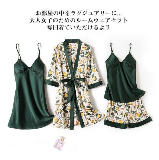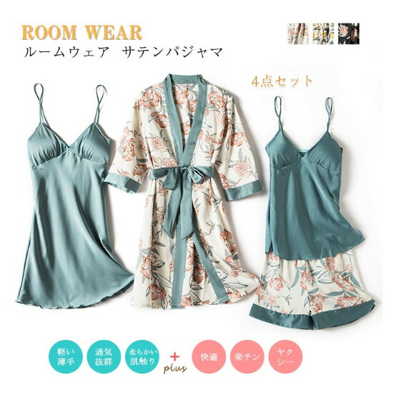 ガウン付 ルームウェア 4点セットサテンパジャマオールシーズン シルクタッチ サテン キャミソール ショットパンツ 薄手 パッド付き セクシー 部屋着 軽く サラサラ 着心地が良い 可愛い 高級感 快
