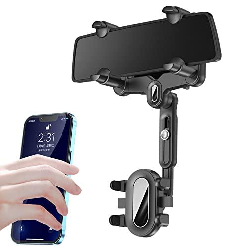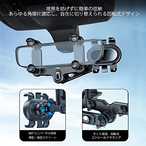 【360°回転・格納式】このリアビューミラーのスマホホルダーは360°回転できます。最適な角度に回転させることができ、運転時の視界に影響を与えません。