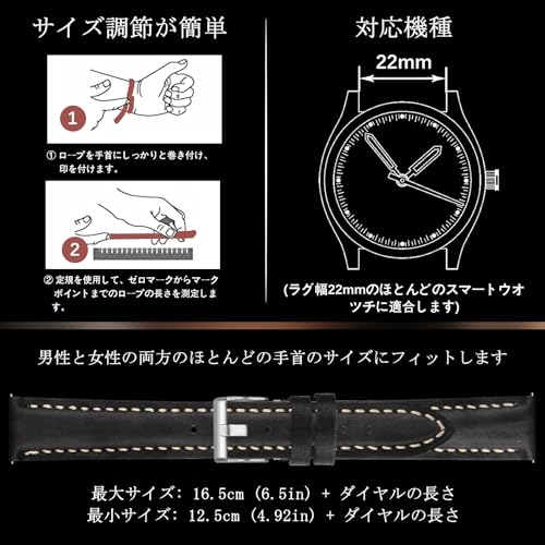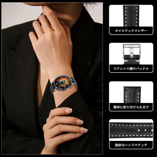時計バンド 18mm 20mm 22mm 対応 交換バンド レザーバンド 腕時計バンド 革製ストラップ ウォッチバンド オイルワックスレザー 交換ベルト替えストラップ 対応 18ミリ 20ミリ 22ミリ Huawei Xiaomi Samsung Amazfit Garmin Ticwatchなどです装着簡単 軽量 調整しやすい 男女通用 (ブラック - 22mm)