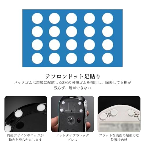 【使用方法】マウスの底面をクリーニングペーパーで清掃し、ホコリや汚れがないことを確認します。 マウスフット裏面の3M粘着紙をはがし、マウスの裏側に軽く押し込んで固定し、強力に接着します。