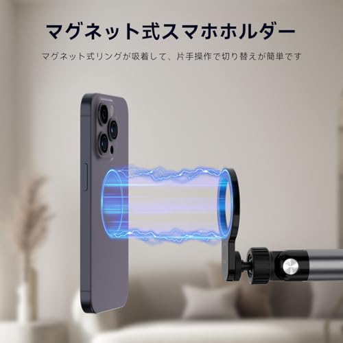 ご注意:2本目の棒の回転仕方は添付ビデオをご覧下さい。【スマホ・タブレット両対応】マグセーフ寝ながらスタンドはスマホ、タブレットの両対応です。iPhone12以降シリーズはそのまま吸着して使用できます。重要な点:その他のiPhone、iPad、androidなどマグセーフ機能を持たない機器は、パッケージに同梱されている磁気シートをスマートフォンの後ろに貼ってご使用くださいます。またはマグセーフ機能のついたケースを装着して使うことができます。ホルダータイプの手間が減り、一秒で吸い付くので便利です。