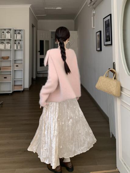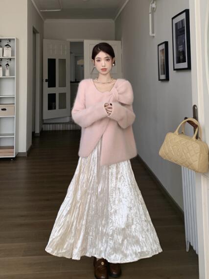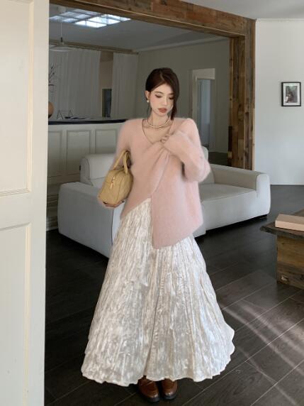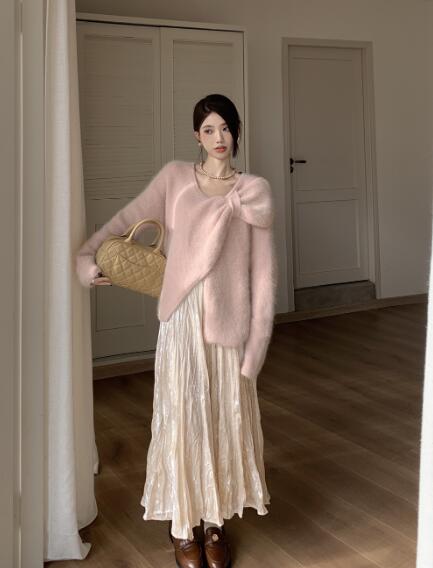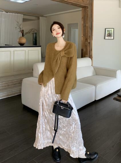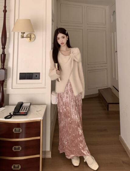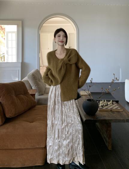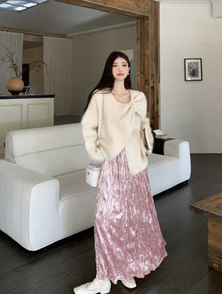 アシンメトリー リボン長袖トップスカッ ボトムス スカート 通販 ベージュ ピンク グリーン