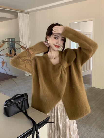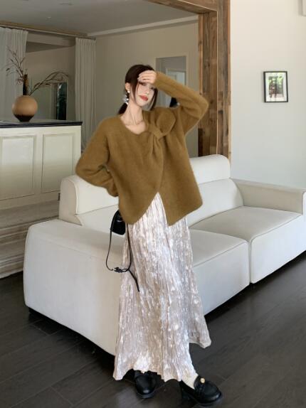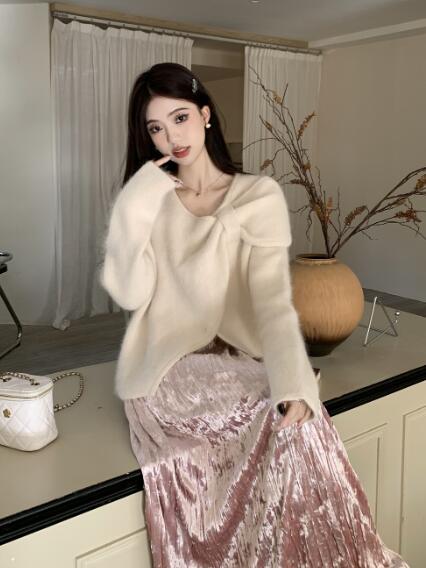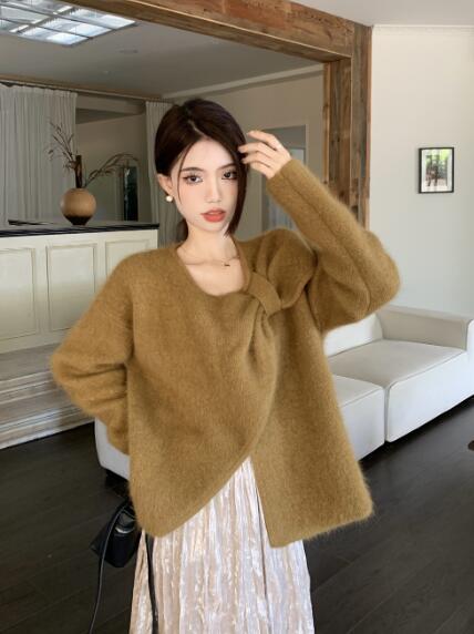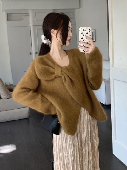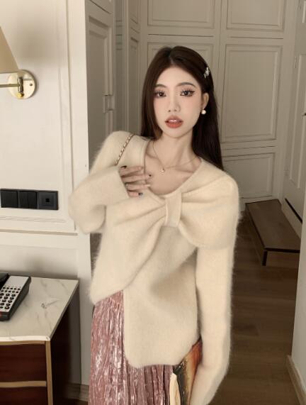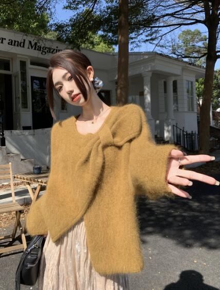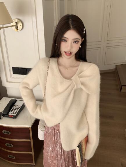 アシンメトリー リボン長袖トップスカットソーニット セーター無地シンプルグリーンベージュピンクレディースガールズストリート奇抜派手韓国かわいい着痩せ普段着