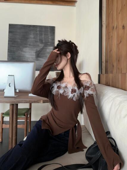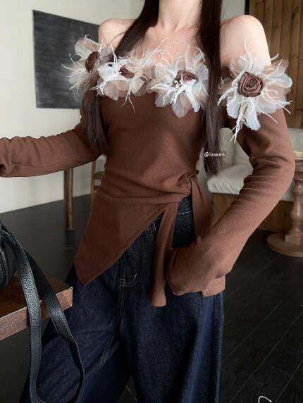 オフショルダー お花立体長袖トップスカットソーインナー無地ブラウンレディースガールズストリート奇抜派手韓国セクシーかわいい着痩せ