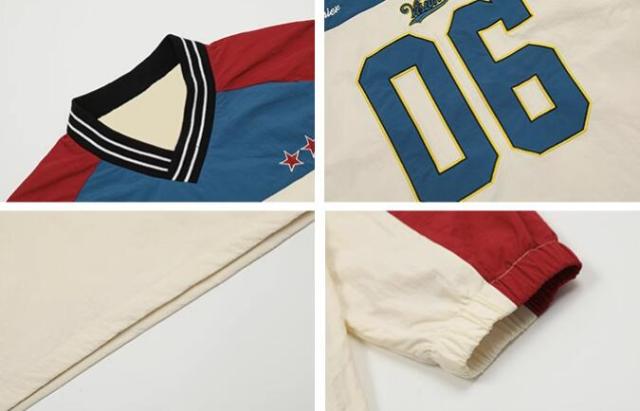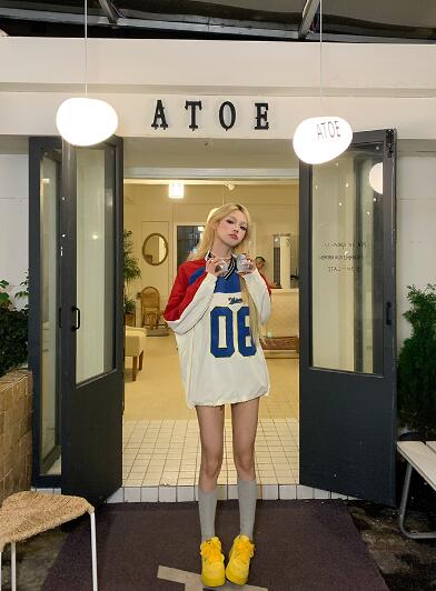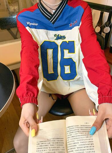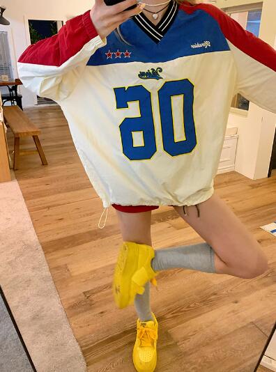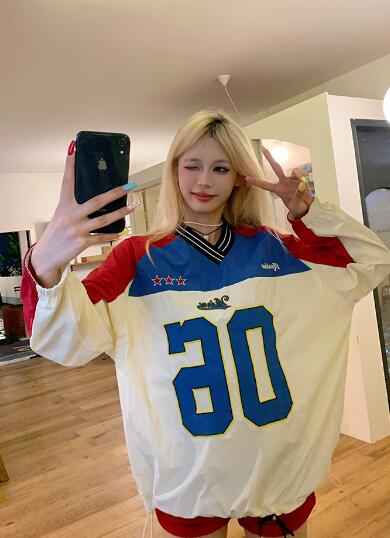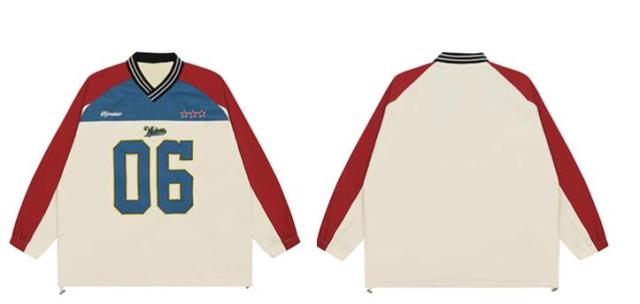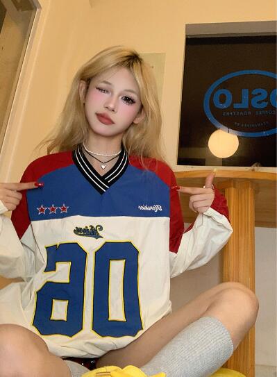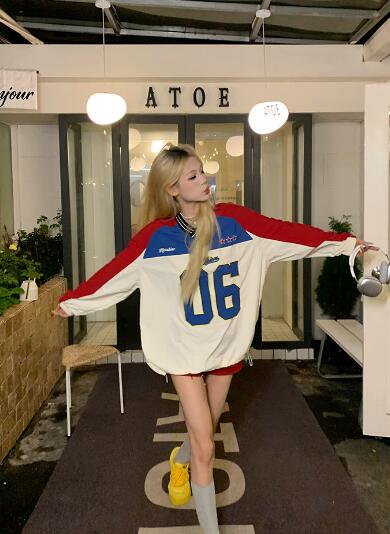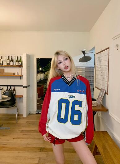 ユニフォーム風ロゴナンバー長袖トップスカットソートレーナーレッドブルー長めダンス衣装ヒップホップHIPHOPレディースメンズガールズストリート韓国おしゃれ奇抜派手大人個性的かわいいかっこいい
