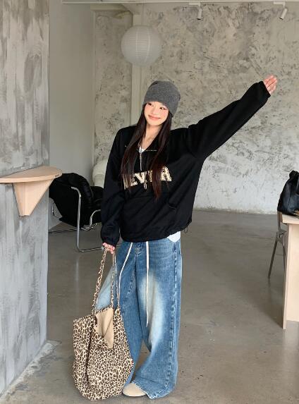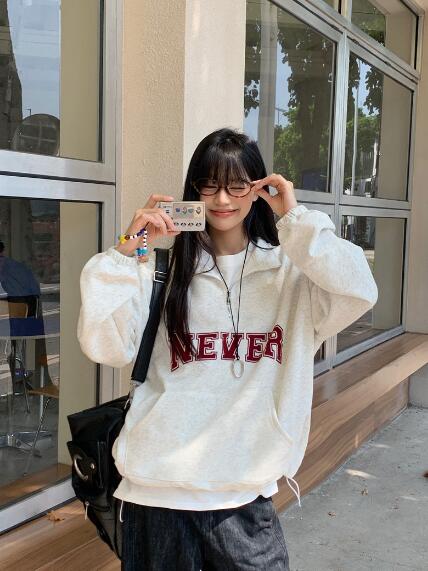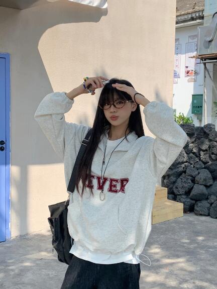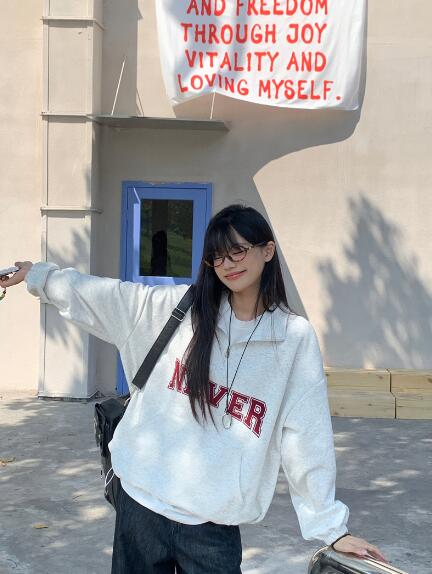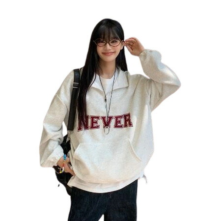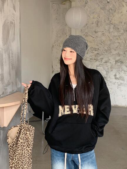 ハーフジップトレーナー2色ロゴジップアップ長袖スウェットトップスカットソー大きいサイズビッグゆったりダンス衣装ヒップホップHIPHOPレディースメンズガールズストリート韓国おしゃれ奇抜派手個性的黒グレ