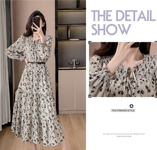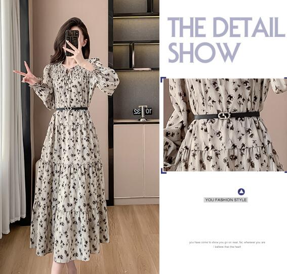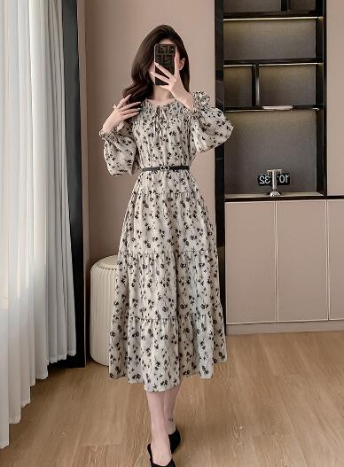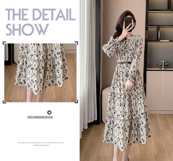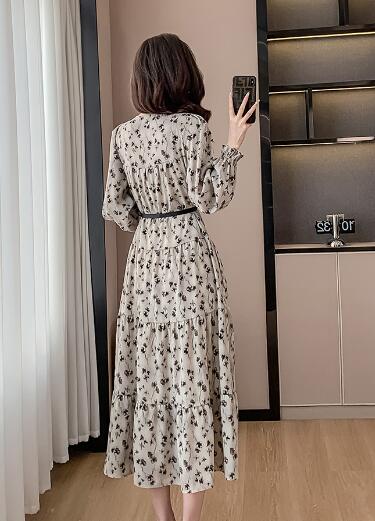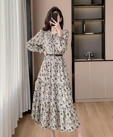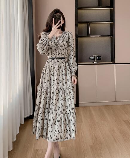 花柄ベルトマキシワンピース ロング丈 ワンピース 長袖 レディース シフォン Vネック きれいめ キレイめ 上品 着痩せ おしゃれ 可愛い お出かけ 通勤 普段着 お呼ばれ