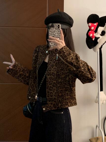 ヒョウ柄ショート丈アウター ジャケットジャンパー短い短め長袖刺繍ブルゾンポケットダンス衣装ヒップホップHIPHOPレディースガールズストリート奇抜派手韓国おしゃれかっこいい