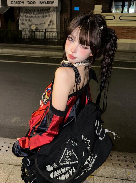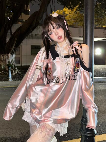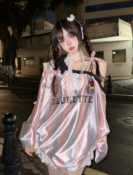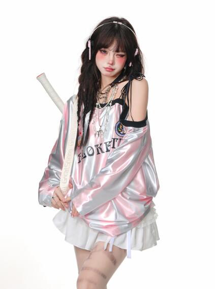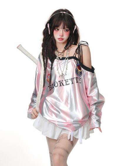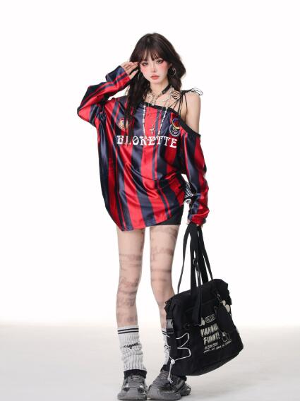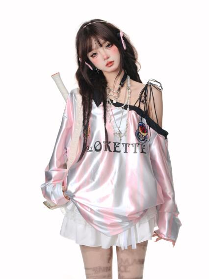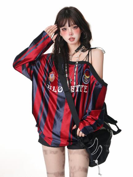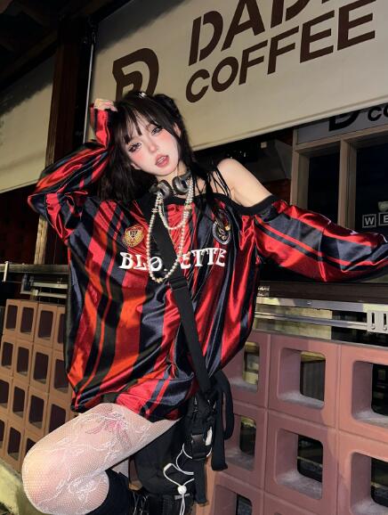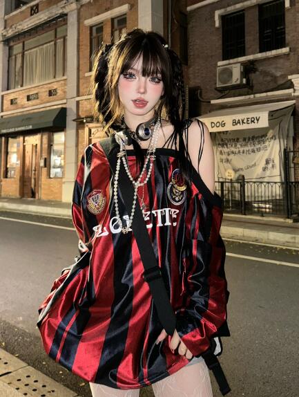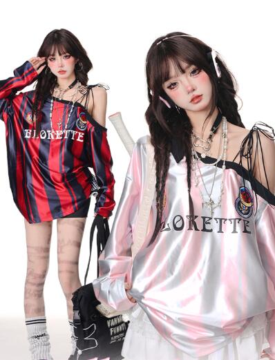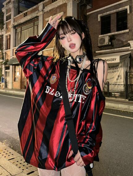 ユニフォーム風ストライプロゴ長袖トップスカットソーtシャツトレーナー長め レッド赤ピンクブラックベースボールスポーツダンス衣装ヒップホップHIPHOPレディースメンズガールズストリートスケーター
