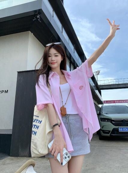 ストライプスマイルちゃんシャツブラウストップスカットソー半袖前開きゆったり大きいサイズシンプルダンス衣装ヒップホップHIPHOPレディースガールズ大人韓国奇抜派手おしゃれ