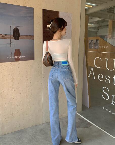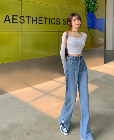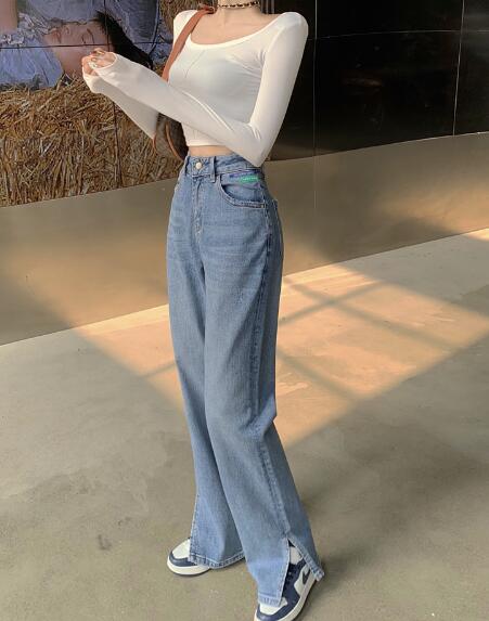 ワッペンデニムジーンズジーパンパンツズボンボトムススリットロングストレートハイウエストダンス衣装ヒップホップHIPHOPレディースガールズストレート無地シンプル青ブルー韓国おしゃれ可愛い奇抜