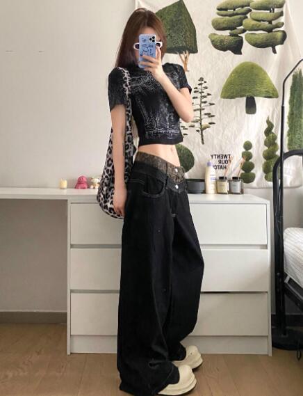ヒョウ柄重ね着デニムジーパンパンツズボンボトムス ダンス衣装 ダンス イベント文化祭 コスチューム 韓国ファッション HIPHOP レディース ガールズストリート 個性的奇抜かっこいい ヒップホップ