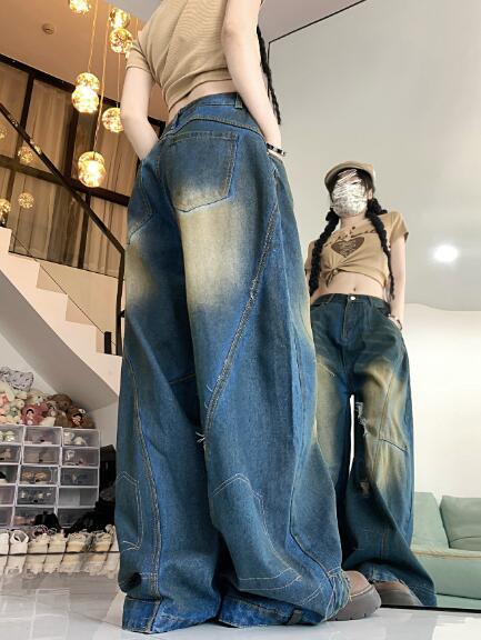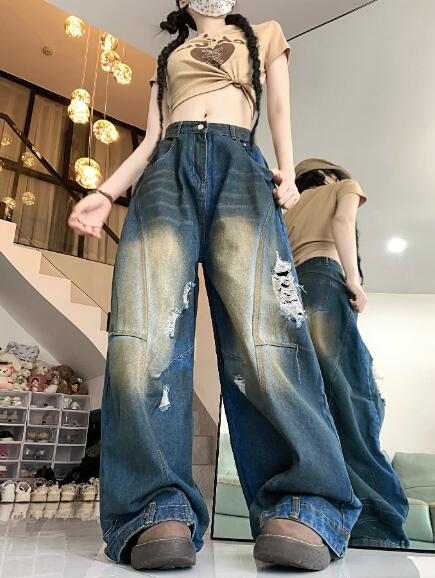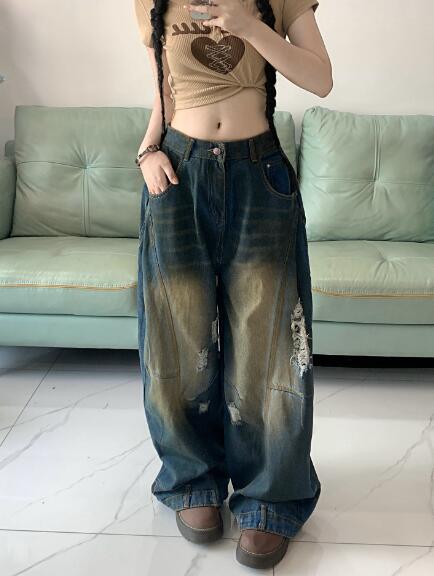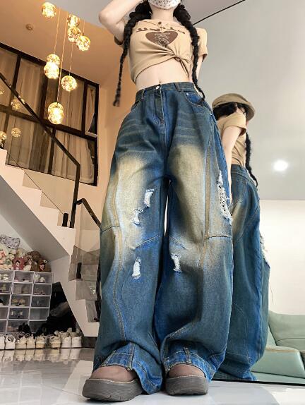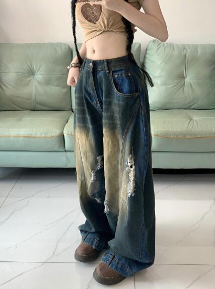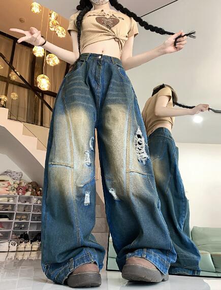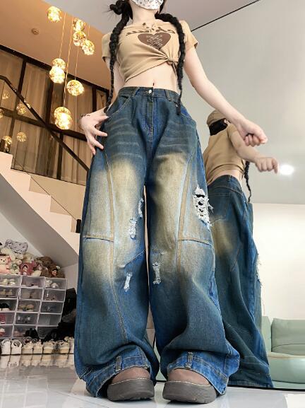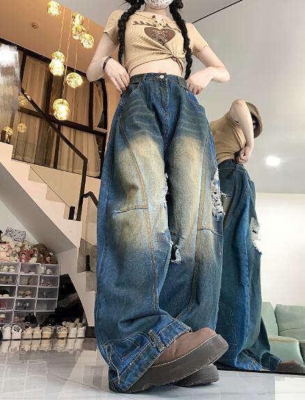 デニムズボンボトムスパンツジーンズジーパン破れ加工ダメージストレートワイド太いロングハイウエストダンス衣装ヒップホップHIPHOPレディースガールズストリート奇抜派手韓国大きいサイズ