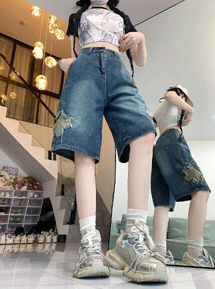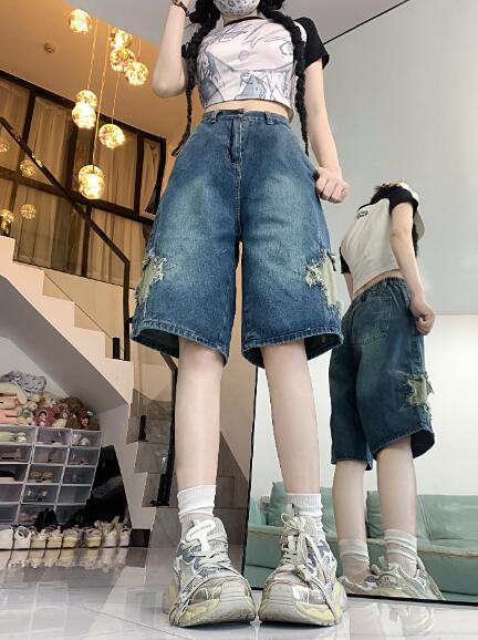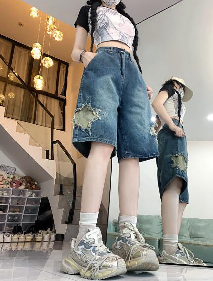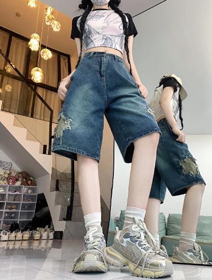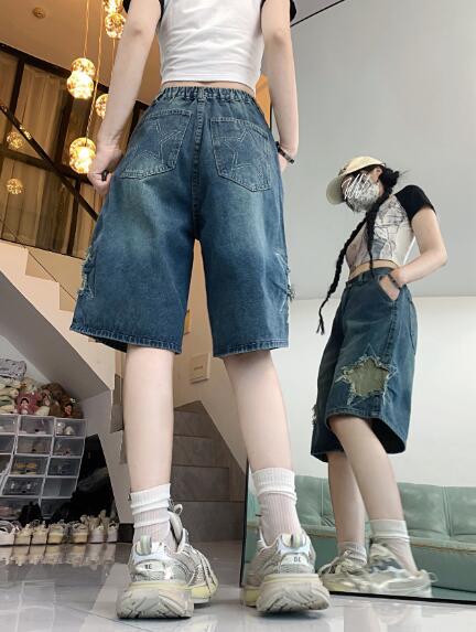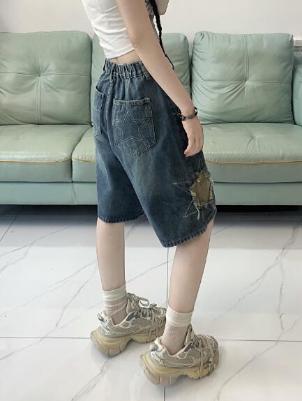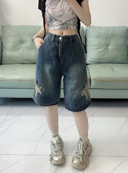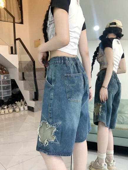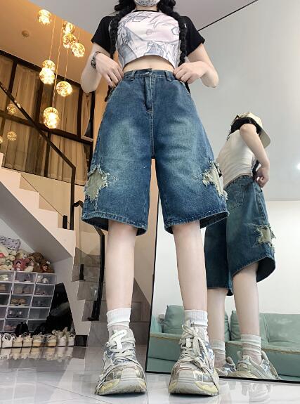 星柄デニムジーパンパンツズボンボトムスショートパンツショーパン半ズボン膝上ダンス衣装 ダンス イベント文化祭 コスチューム 韓国ファッション HIPHOP レディースガールズ 個性的かっ ヒップホップ