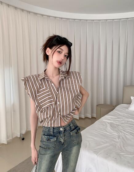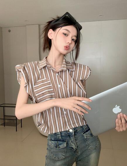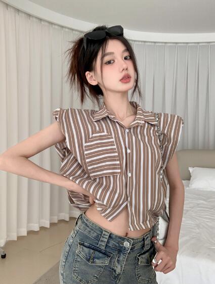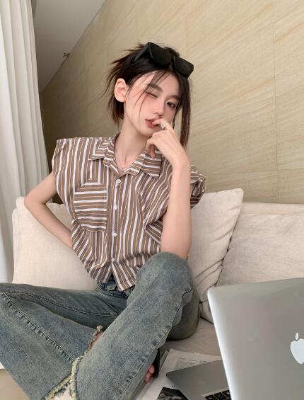 ストライプ短い短め半袖 シャツ ブラウ レディースファッション 続々登場