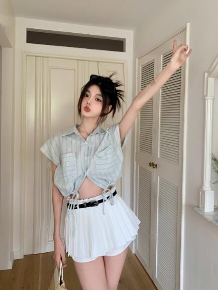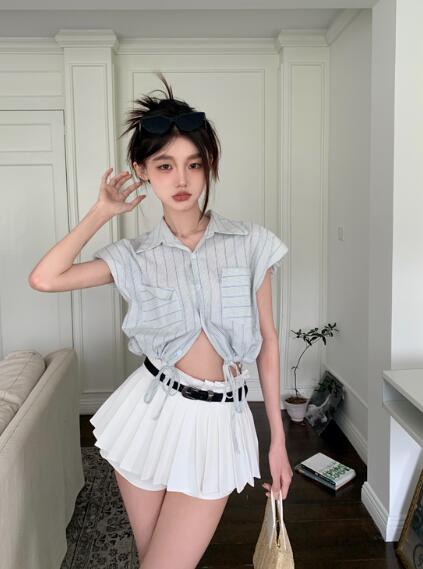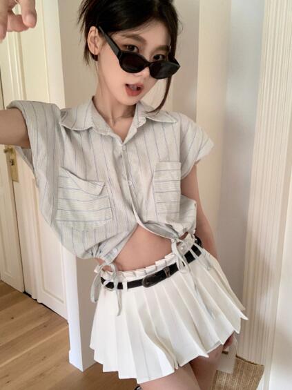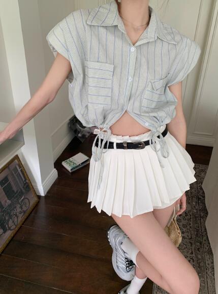 ストライプ短い短め半袖 絞りシャツ ブ レディースファッション 続々登場