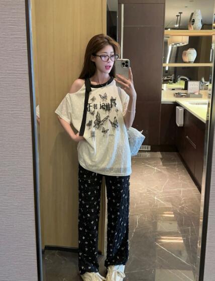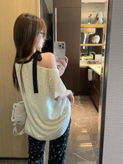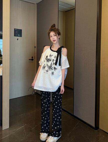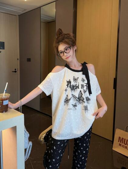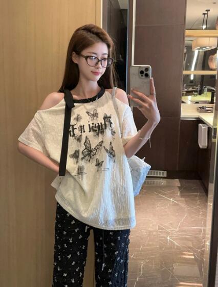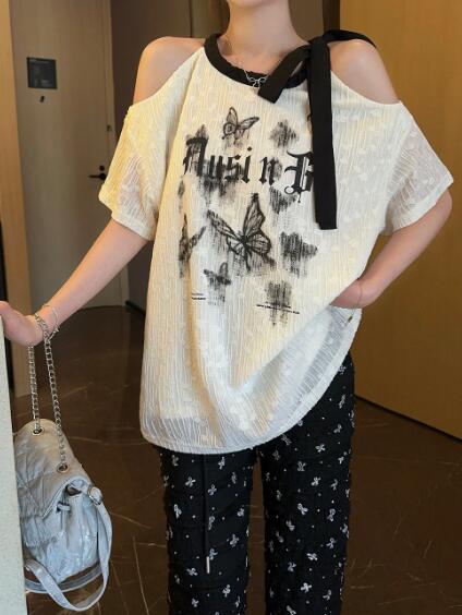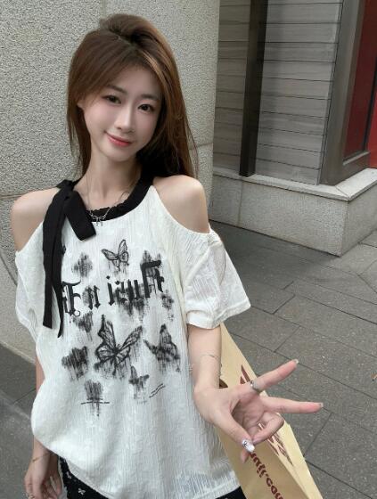 ちょうちょ肩出しキャミソールセクシー 半袖トップスカットソーTシャツシンプルダンス衣装ヒップホップHIPHOPレディースガールズストリート個性的奇抜韓国おしゃれ肌見せ派手かっこいい