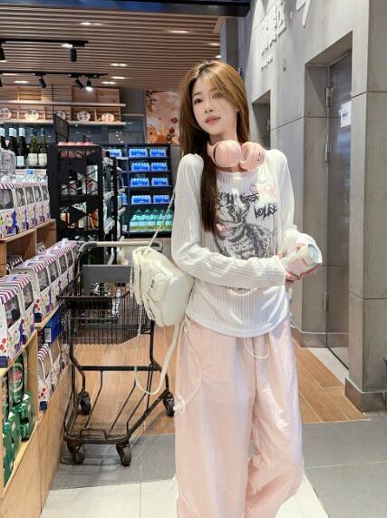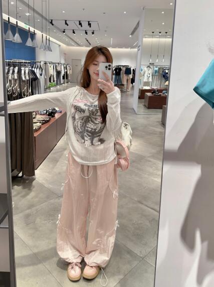 猫ネコリボン 長袖トップスカットソーTシャツシンプルダンス衣装ヒップホップHIPHOPレディースガールズストリート個性的奇抜韓国おしゃれ可愛い