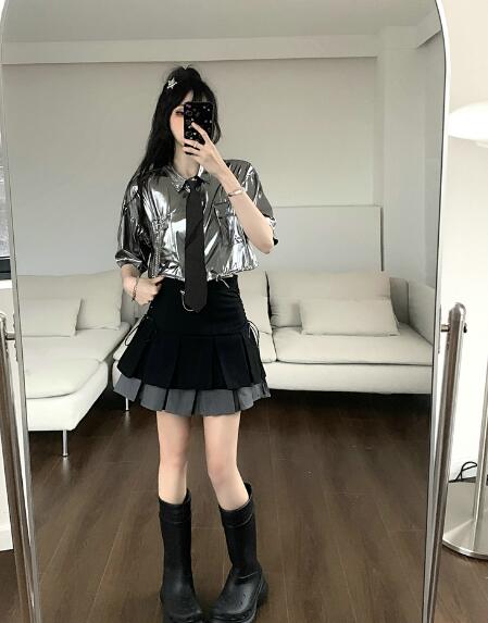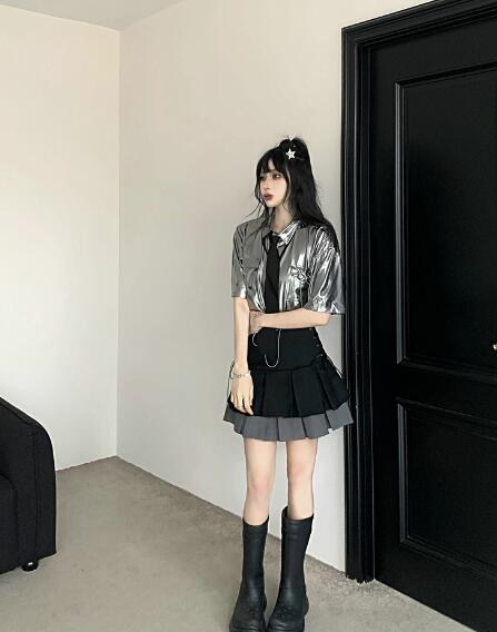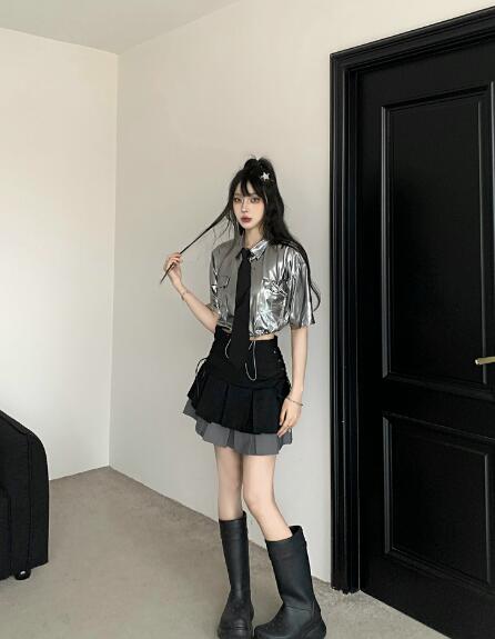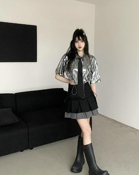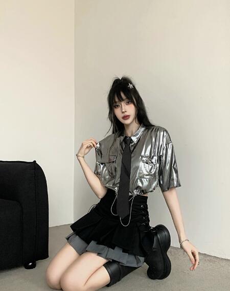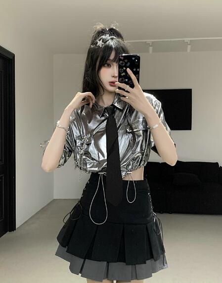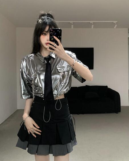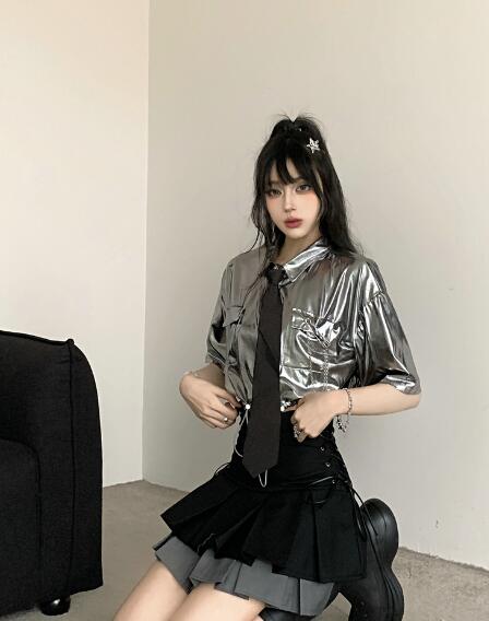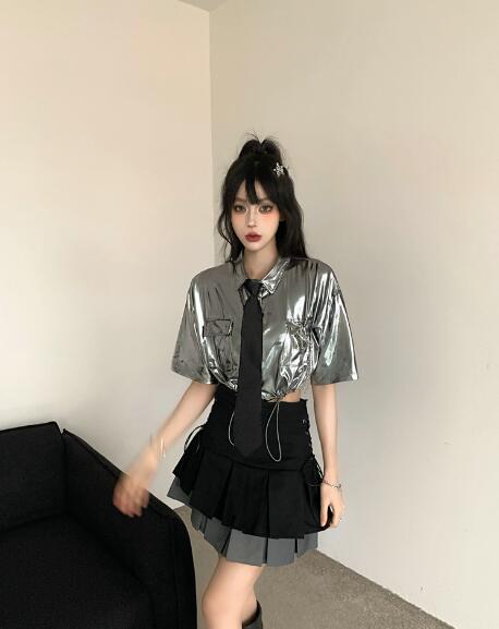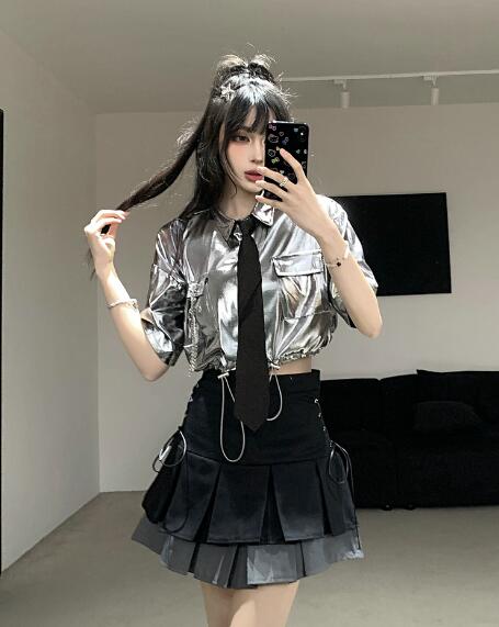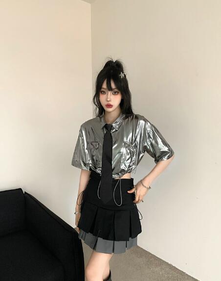 ♪S~XL展開♪ネクタイシャツブラウストップスカットソー半袖シルバー銀色短い短め安全ピン前開きへそ出しセクシー大きいサイズダンス衣装ヒップホップHIPHOPレディースガールズ大人韓国個性的奇抜派手おし