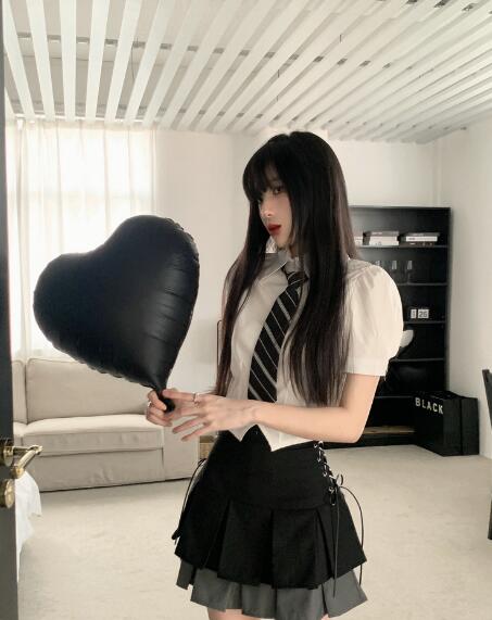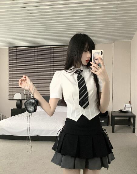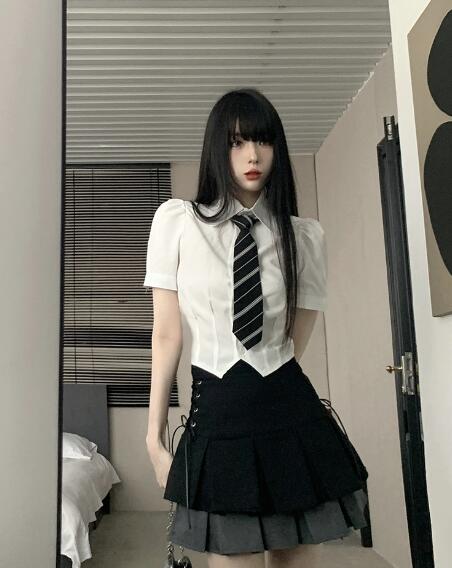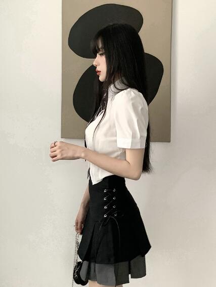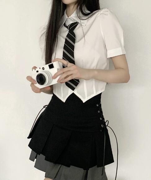 ♪S~L展開♪ネクタイシャツブラウストップスカットソー半袖短い短め前開きセクシー大きいサイズダンス衣装ヒップホップHIPHOPレディースガールズ大人韓国個性的奇抜派手おしゃれ