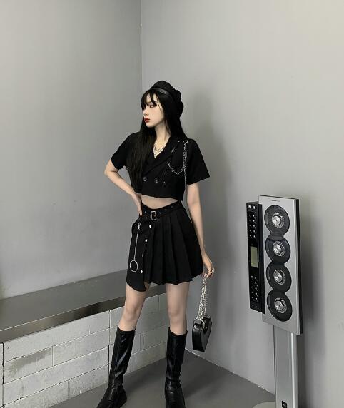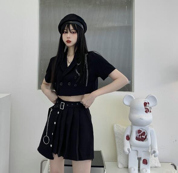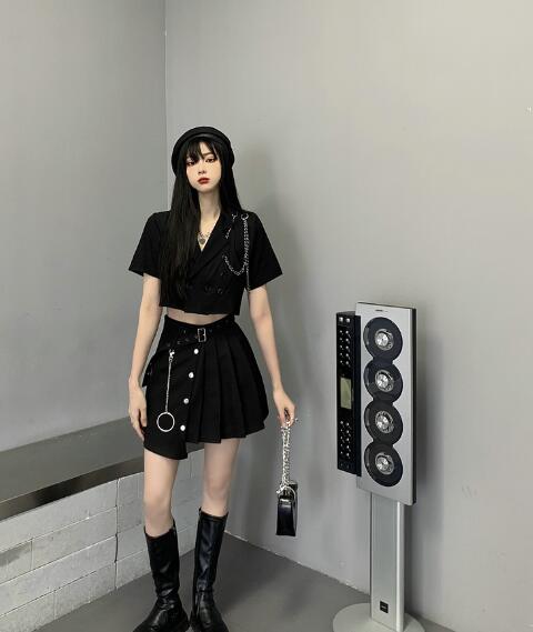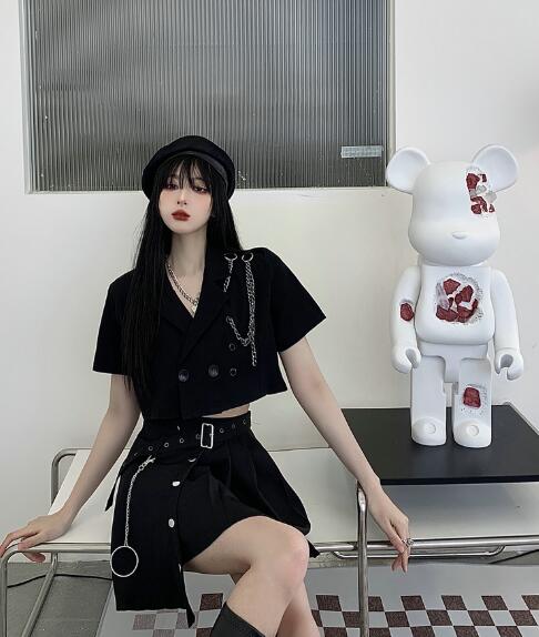♪S~XL展開♪チェーン付きトップスジャケットアウター薄手 半袖短い短め前開き大きいサイズダンス衣装ヒップホップHIPHOPレディースガールズ大人韓国個性的奇抜派手おしゃれ