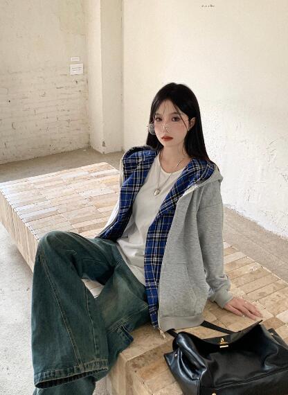 重ね着風チェック柄フードフーディートレ トップス パーカー 早い者勝ち S M L XL
