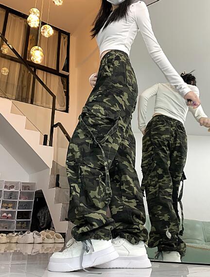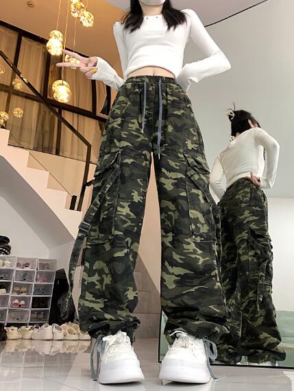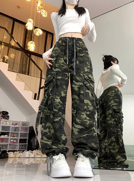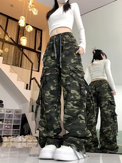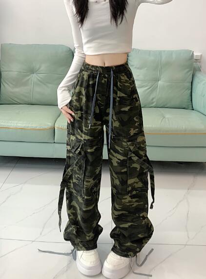 迷彩ミリタリーカーゴパンツデニムズボンボトムスパンツジーンズジーパンゴムベルトストレートロングシンプルダンス衣装ヒップホップHIPHOPレディースガールズメンズストリート奇抜派手韓国ビッグ大きいサイズ