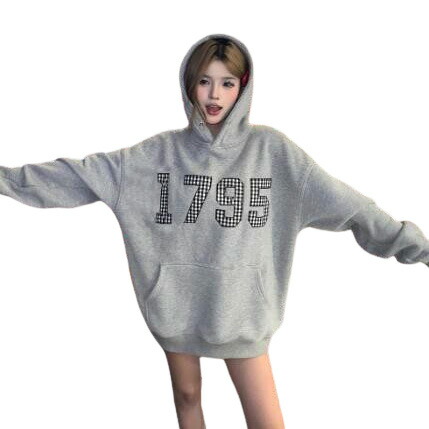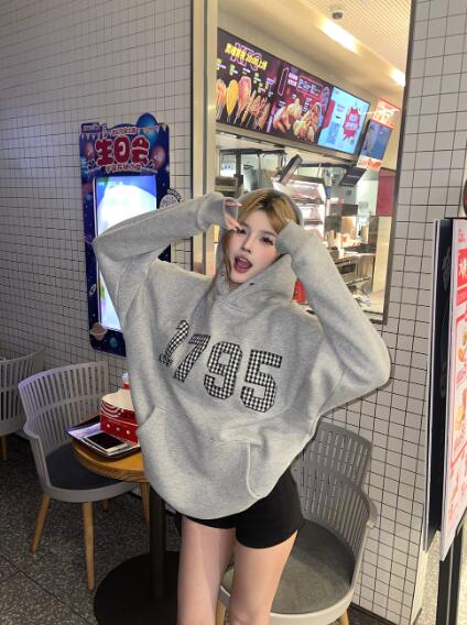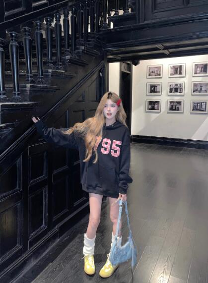 ナンバーワッペン厚手裏起毛フードフーディートレーナー パーカートップススウェットポケット長袖大きいサイズビッグゆったりダンス衣装ヒップホップHIPHOPレディースガールズストリート個性的韓国ファッショ