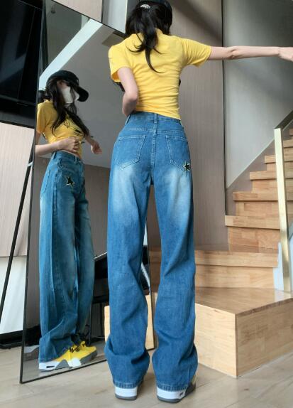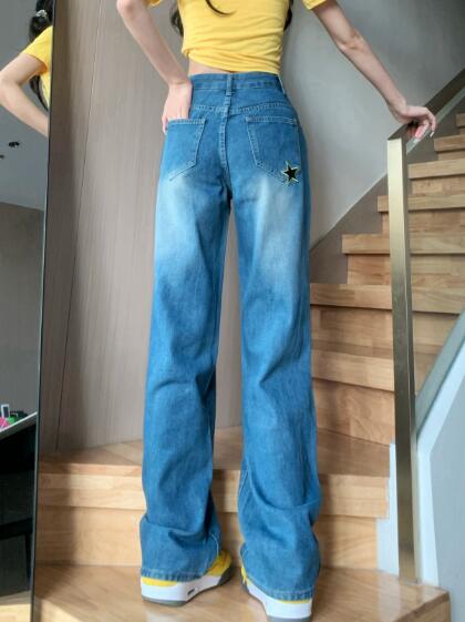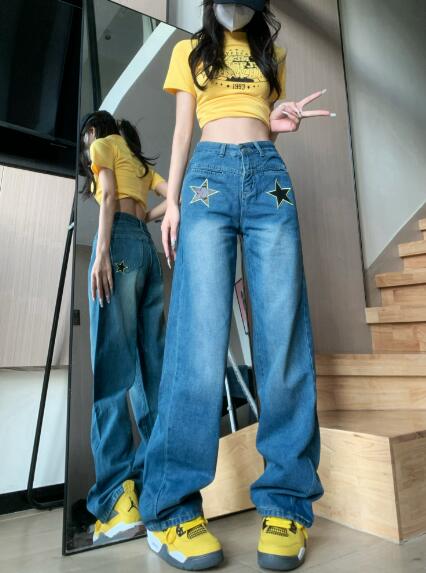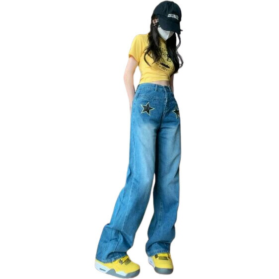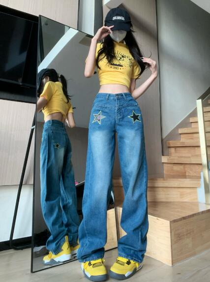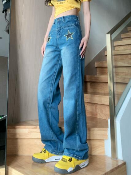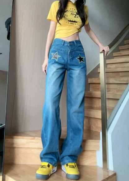 星柄デニムズボンボトムスパンツジーンズジーパンストレートロングシンプルダンス衣装ヒップホップHIPHOPレディースガールズストリート奇抜派手韓国ビッグ大きいサイズかっこいい