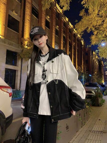 バイカラーチェーンジージャンデニムジャケット長袖Gジャンブラック黒白ホワイトボタンポケットビッグ大きいサイズダンス衣装ヒップホップHIPHOPレディースメンズガールズ大人ストリートアウタージャンパー韓