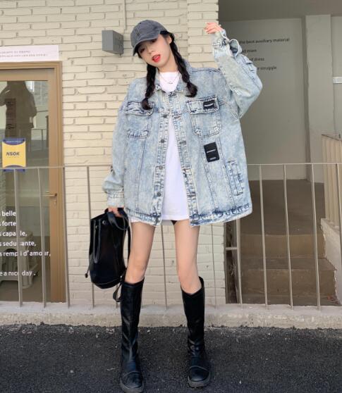 ワッペンバックプリントジージャンデニムジャケット長袖Gジャンホワイト 青ボタンポケットビッグ大きいサイズダンス衣装ヒップホップHIPHOPレディースメンズガールズ大人ストリートアウタージャンパー韓国