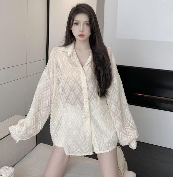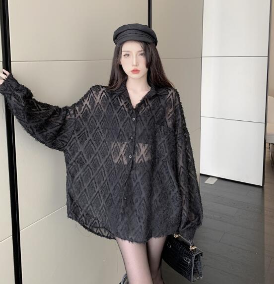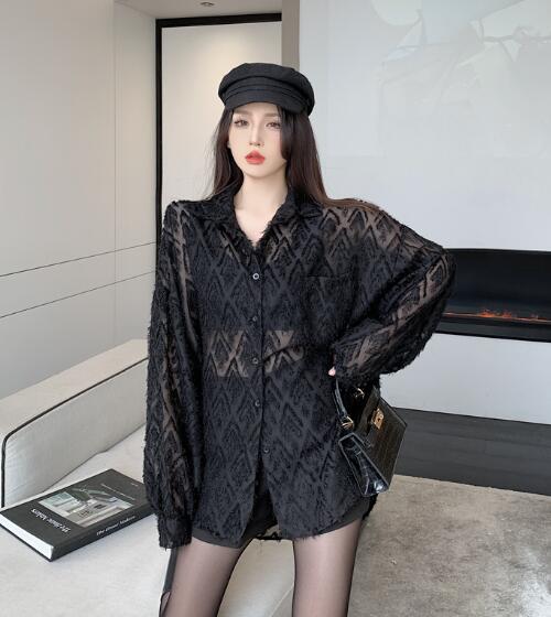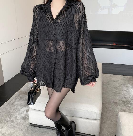 シースルートップスカットソーシャツブラウス長袖透け感前開き ダンス衣装ヒップホップHIPHOPレディースガールズストリート個性的奇抜派手韓国おしゃれかっこいい