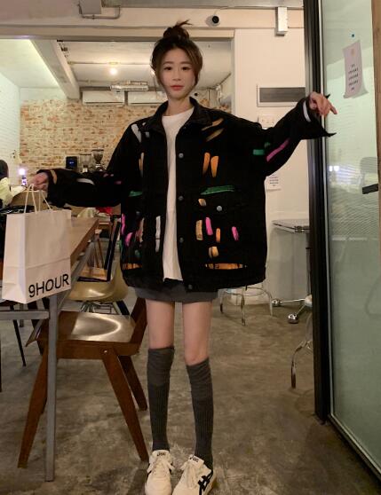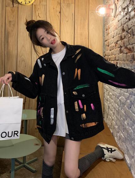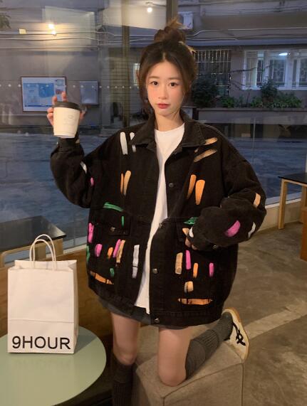プリントバックプリントジージャンデニムジャケット長袖Gジャンブラック黒ボタンポケットビッグ大きいサイズダンス衣装ヒップホップHIPHOPレディースメンズガールズ大人ストリートアウタージャンパー韓国