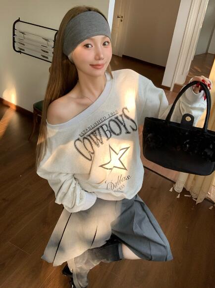 ロゴ星柄トップスカットソートレーナー長袖シンプルビッグ大きいサイズ長めグレーネイビーダンス衣装ヒップホップHIPHOPレディースガールズストリート韓国おしゃれ奇抜派手カジュアル