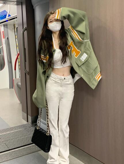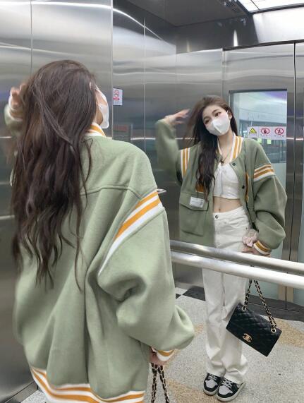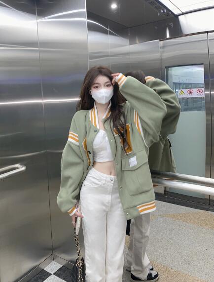 刺繍スタジャンベースボールジャケット韓国系ファッション韓国ジャケットブルゾンジャンパーレディースメンズグリーンラインダンス衣装ダンス発表会文化祭イベント個性的奇抜ストリートHIPHOPアウター