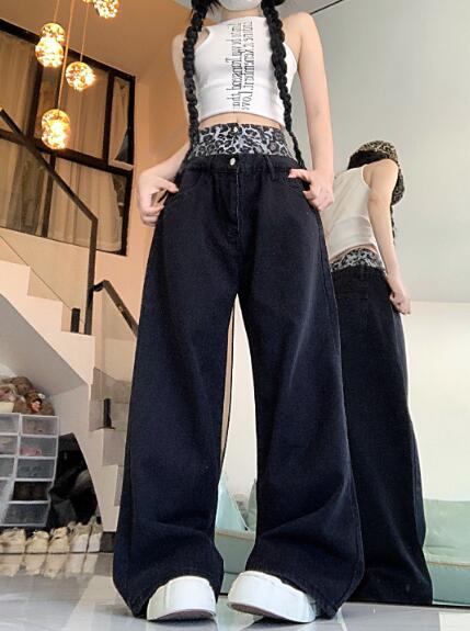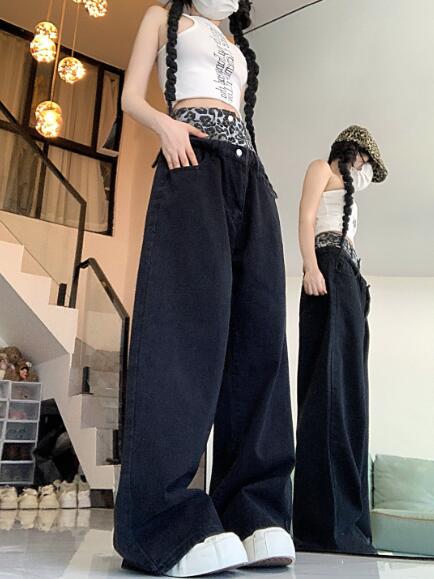 ♪S~XL展開♪ヒョウ柄切替重ね着風デニムズボンボトムスパンツジーンズジーパンストレートロングダンス衣装ヒップホップHIPHOPレディースガールズストリート奇抜派手韓国ビッグ大きいサイズかっこいい