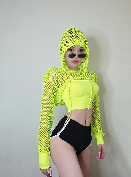 メッシュトップス2色長袖ショート丈短い短めへそ出し無地シンプルセクシーダンス衣装ヒップホップHIPHOPレディースガールズストリート奇抜派手黒緑蛍光色透け感編み込み韓国