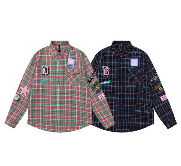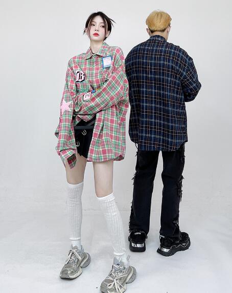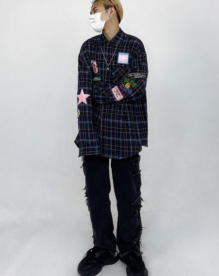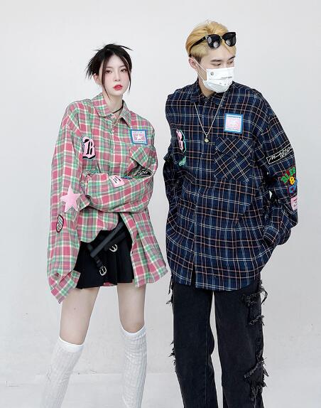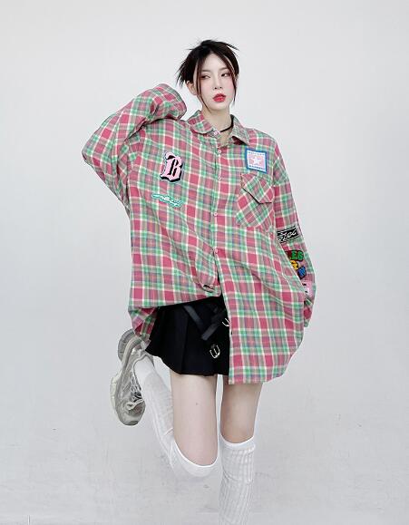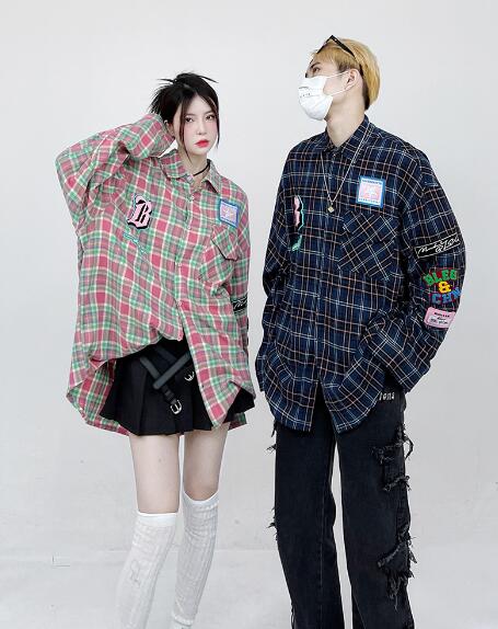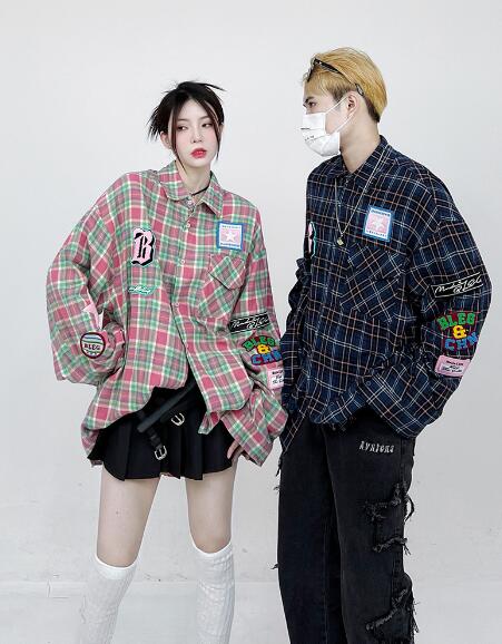 ♪M~2XL展開♪チェックシャツブラウストップスカットソー長袖前開きワッペンゆったり大きいサイズダンス衣装ヒップホップHIPHOPレディースメンズガールズ大人韓国かわいい奇抜派手総柄柄シャツ韓国おしゃ