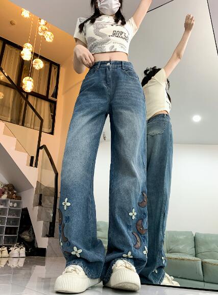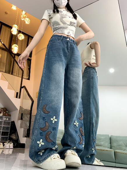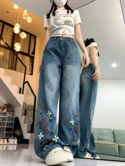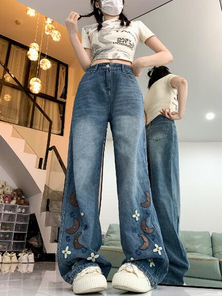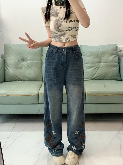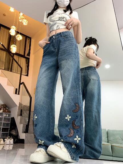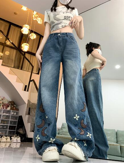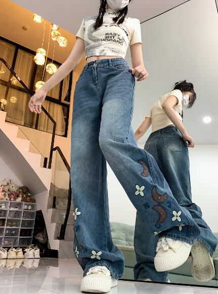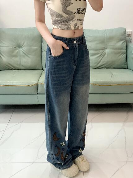 ワッペンスタッズデニムズボンボトムスパンツジーンズジーパンワイド太いシンプルダンス衣装ヒップホップHIPHOPレディースガールズストリート奇抜派手韓国ビッグ大きいサイズ