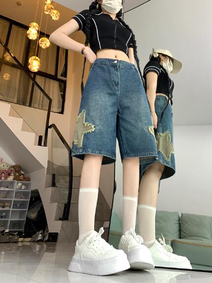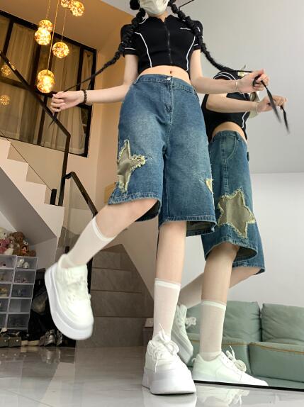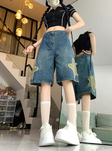 星柄ワッペンデニムズボンボトムスパンツジーンズジーパン半ズボン膝上ワイド太いシンプルダンス衣装ヒップホップHIPHOPレディースガールズストリート奇抜派手韓国ビッグ大きいサイズ