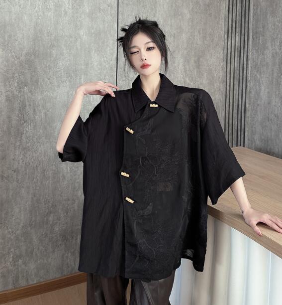 チャイナ風チャイナボタンチャイナ服半袖鶴透け感トップスシャツブラウス ビッグシルエット ゆめかわいい 奇抜 派手 ダンス 衣装 ヒップホップ コスチューム 個性的 服 原宿系オーバーサイ 大きいサイズ