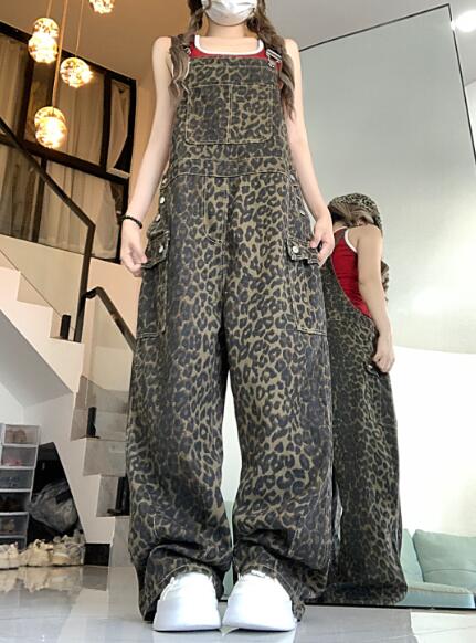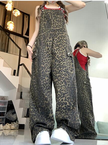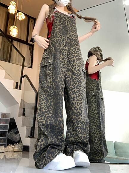 ヒョウ柄デニムオーバーオールサロペットオールインワンつなぎジーンズジーパンパンツズボンロングストレートワイド太いゆったりビッグシンプルダンス衣装ヒップホップHIPHOPレディースガールズストリートおし