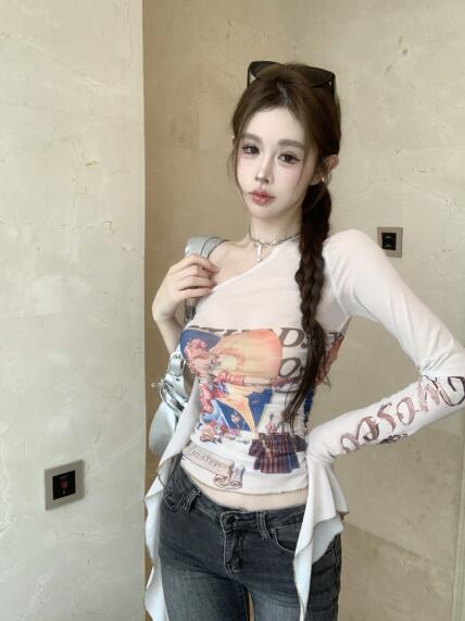 シースルー肩出しトップスカットソー長袖透け感Tシャツインナー薄手 ダンス衣装ヒップホップHIPHOPレディースガールズストリート個性的奇抜派手韓国おしゃかっこいいセクシー