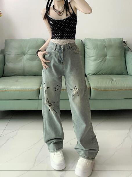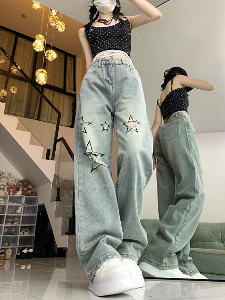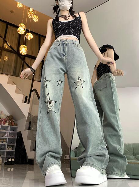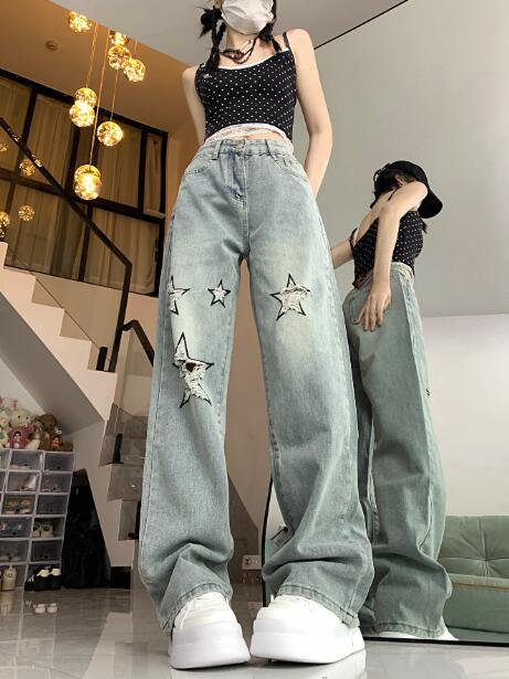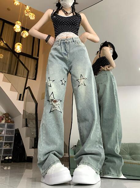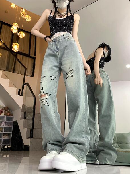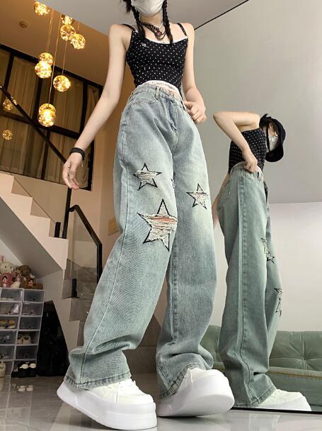 星柄 クラッシュ破れ加工デニムズボンボトムスパンツジーンズジーパンシンプルダンス衣装ヒップホップHIPHOPレディースガールズメンズストリート奇抜派手韓国ビッグ大きいサイズ