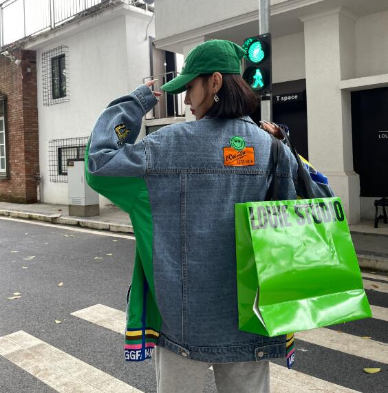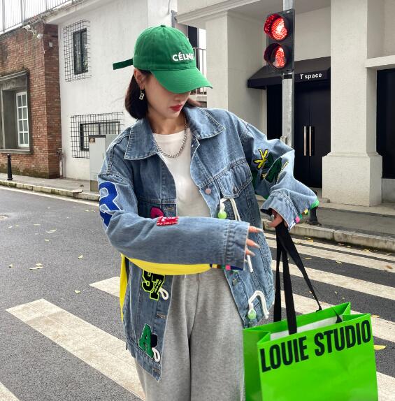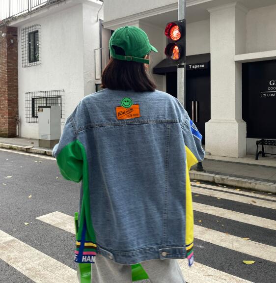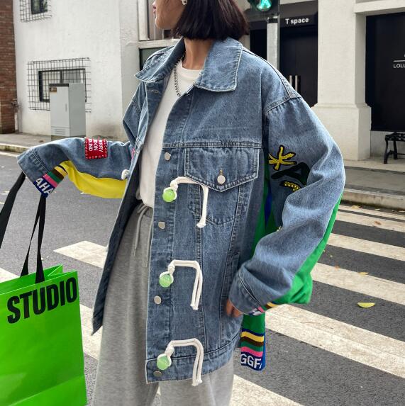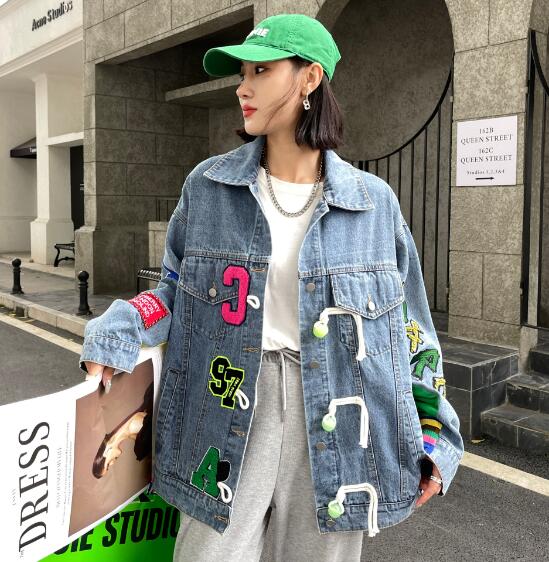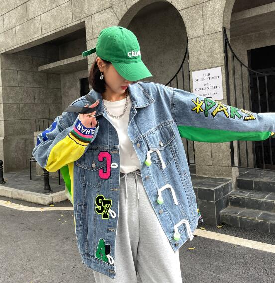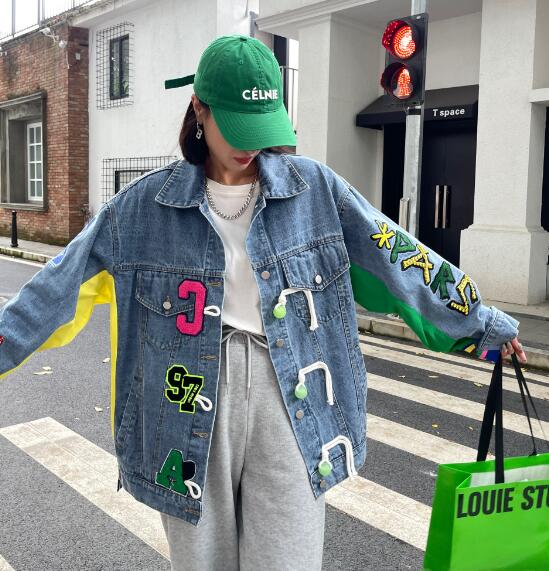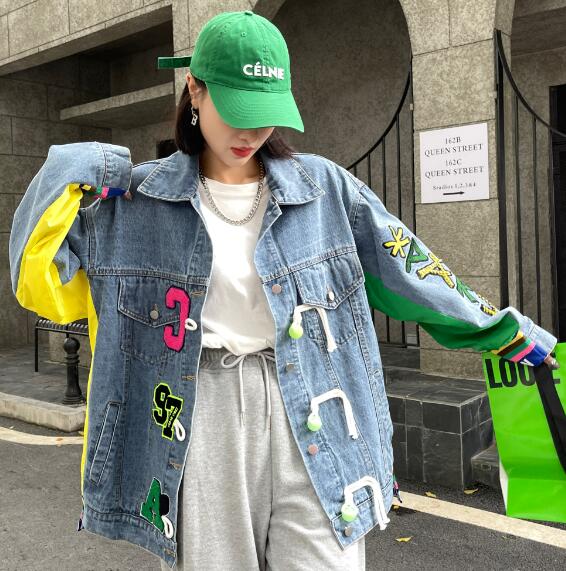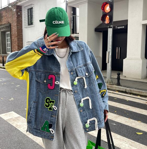 ロゴジージャンデニムジャケットアウタービッグポケット長袖 ビッグシルエット ゆめかわいい 奇抜 派手 ダンス衣装 韓国ファッション 大きいサイズ 個性的 原宿系オーバーサイズ レディース きれいめ 服