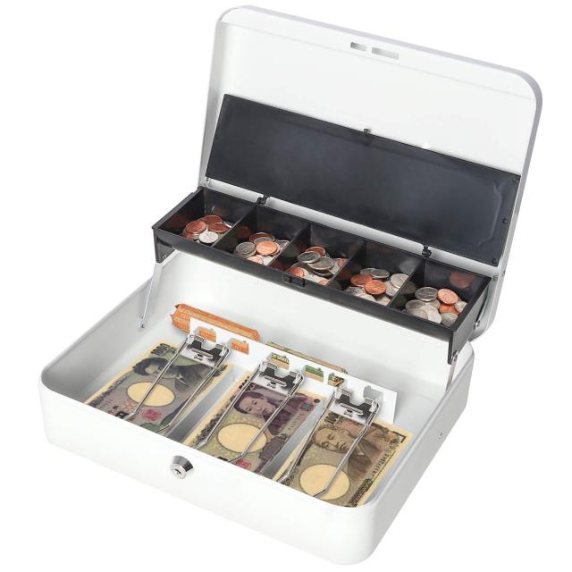 ◆商品名:Jssmst(ジェスマット) 手提金庫 キーロック式 会計用コインケース 3つスプリングクリップ 紙幣整理 金属製 30x24x8.8cm(白 キーロック)
