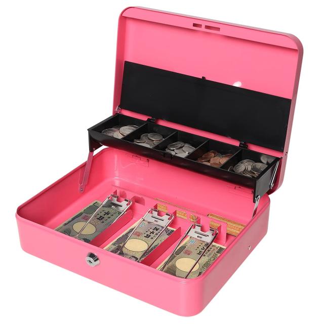 Jssmst(ジェスマット) 手提金庫 キーロック式 会計用コインケース 3つスプリングクリップ 紙幣整理 金属製 30x24x8.8cm(ピンク キーロ