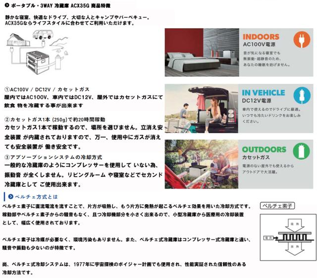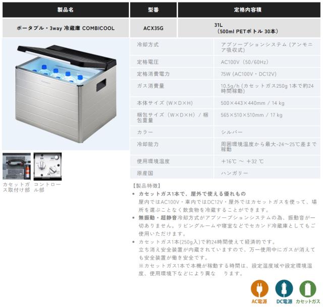 「キャンプ・BBQ・釣り」「クーラーボックス」「冷蔵庫・保冷庫」「車で使える」「ガスカセット対応」 ACX35G 幅50cm 場所を選ばない3-WAY電源(AC100V・DC12V・カセットガス)無振動・超静音
